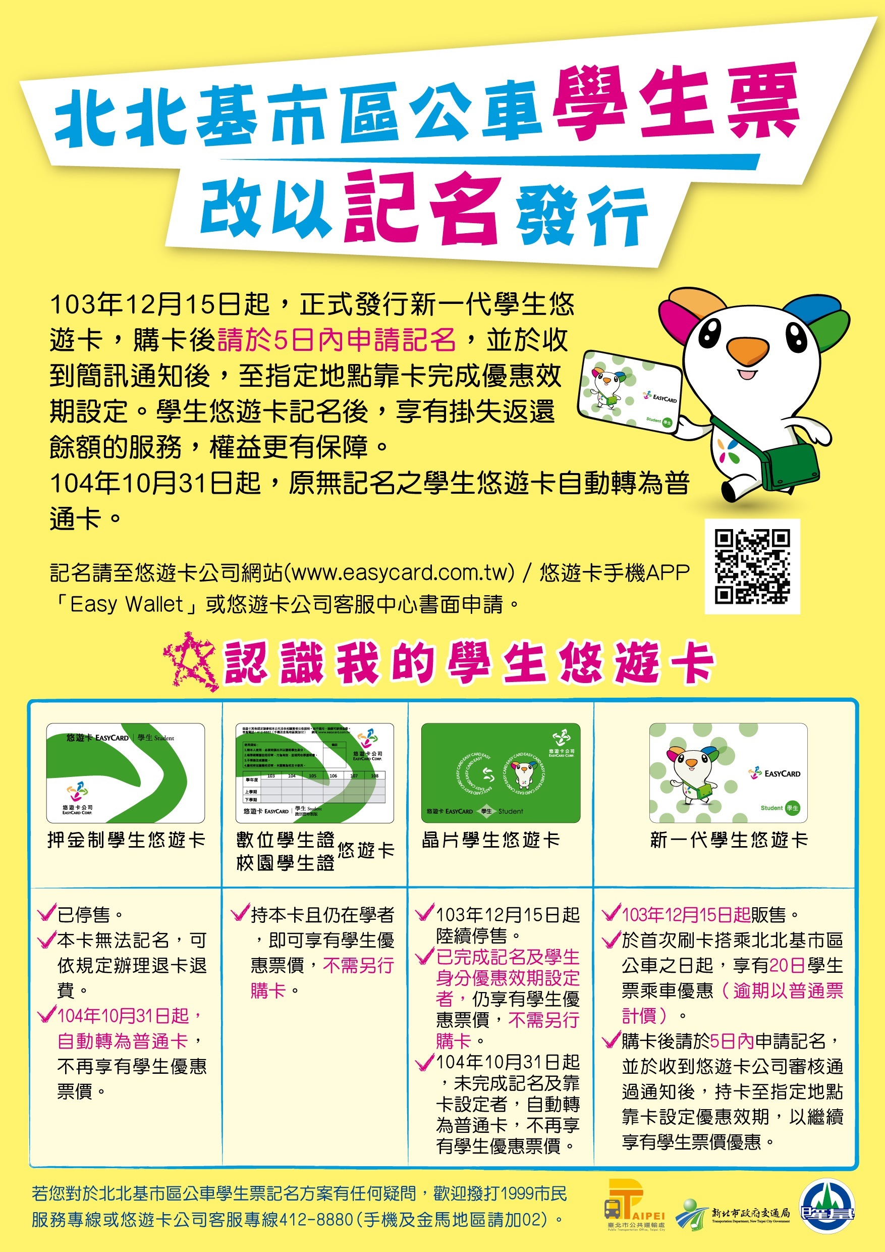 相關資訊請參考廣宣海報,或請撥打北北基三市1999市民服務專線或悠遊卡公司客服專線02-412-8880詢問。