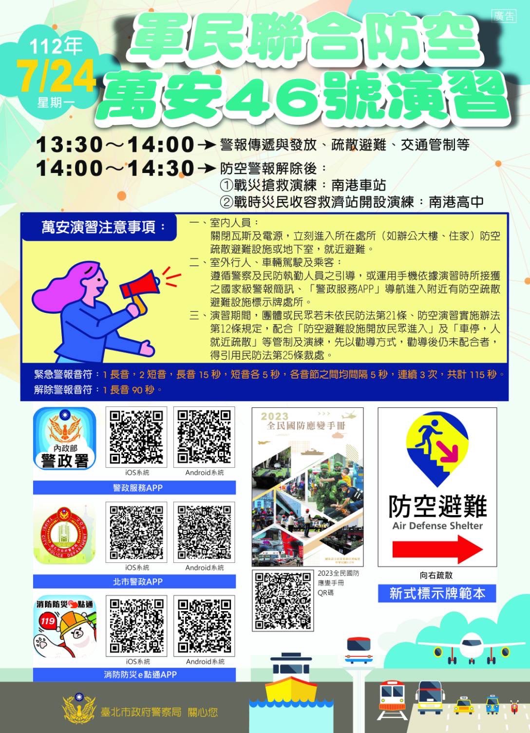 112年軍民聯合防空「萬安46號演習」北部地區訂在7月24日下午1點30分發放緊急警報,下午2點解除警報,請民眾配合以免受罰。