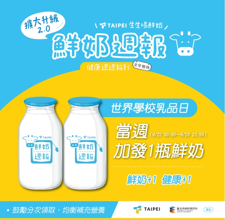 9月24日是「世界學校乳品日」(World School Milk Day),臺北市政府教育局為響應聯合國世界糧農組織(FAO)將每年9月的最後一個星期三訂為「世界學校乳品日」,宣布「鮮奶週報—生生喝鮮奶」將於乳品日當週(9月22日至9月28日)推出加碼活動,符合資格的學童當週可兌換2瓶鮮奶或豆漿,營養補給翻倍。請大家記得去領取喔!!