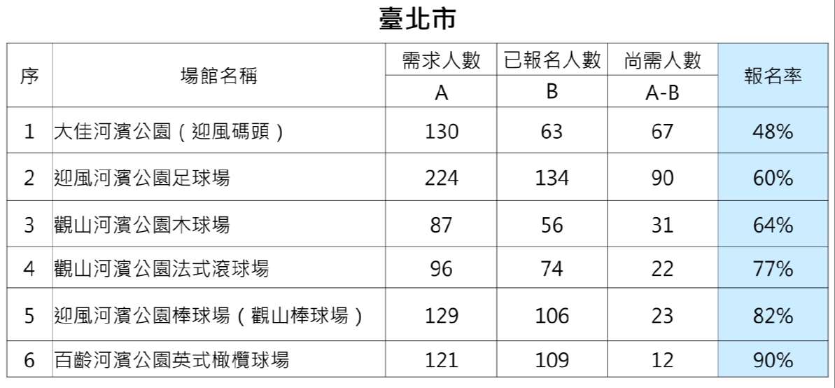 2025雙北世界壯年運動會志工報名即將於近期內截止,歡迎踴躍報名參加,賽會本市共有28個賽館,尚有6個場館尚有志工缺額,本市尚需招募志工之場館一覽表如附件所示。