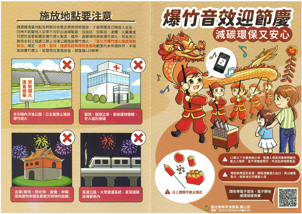 二、學校、安親班、幼兒園、臺北市河濱公園、高速公路、大眾 捷運系統及高架道路路權範圍內、古蹟、醫院、護理之家、產後護理機構及老人福利機構等場所及基地範圍內禁放爆竹煙火。