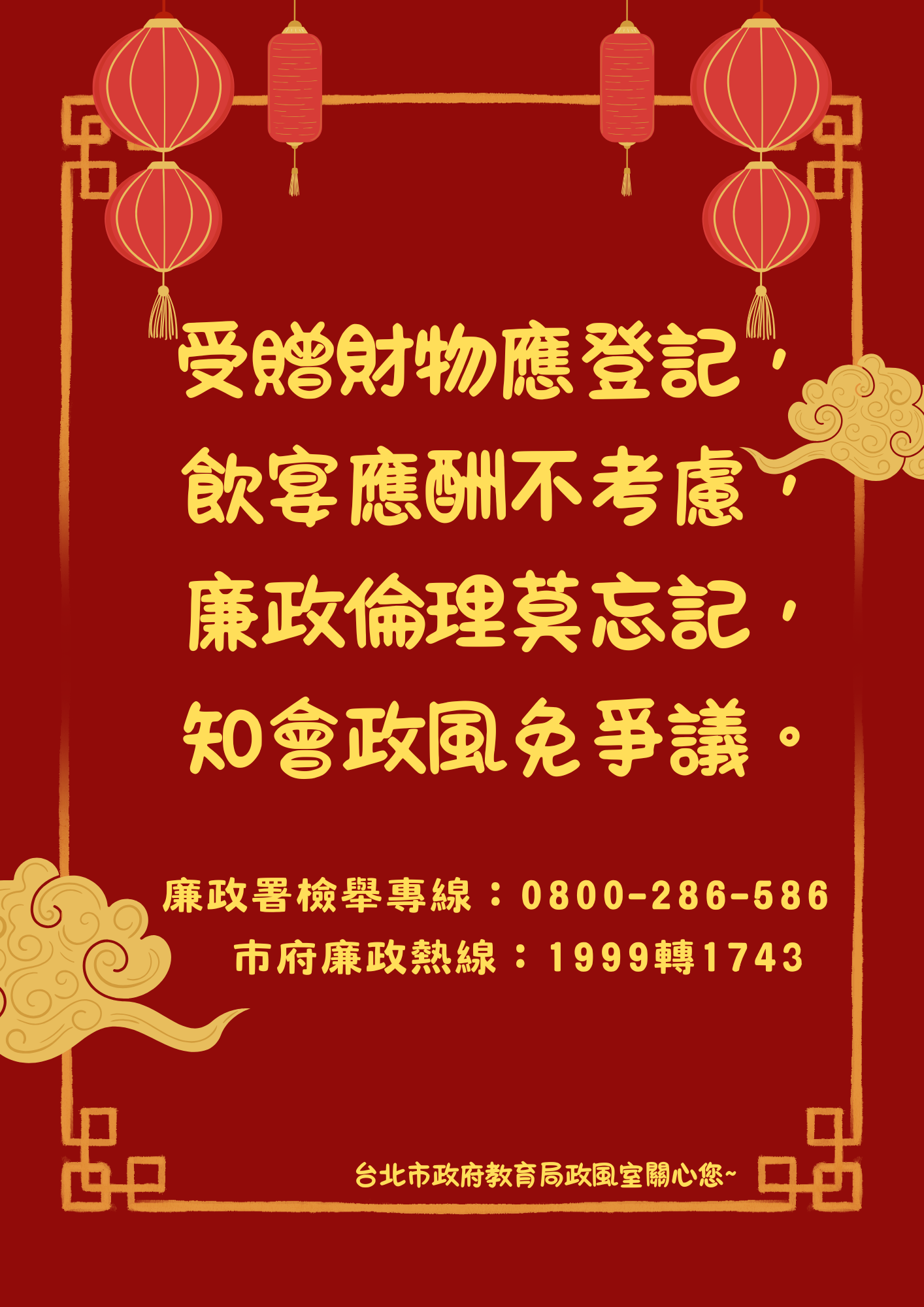 春節將屆,餽贈、邀宴行為較為頻繁,請同仁們恪遵「臺北市政府公務員廉政倫理規範」規定,對與職務有利害關係者之受贈財物、飲宴應酬、請託關說及其他廉政倫理事件,應依規定確實報備登錄,並避免酒駕、出入不正當場所之違法違紀行為。