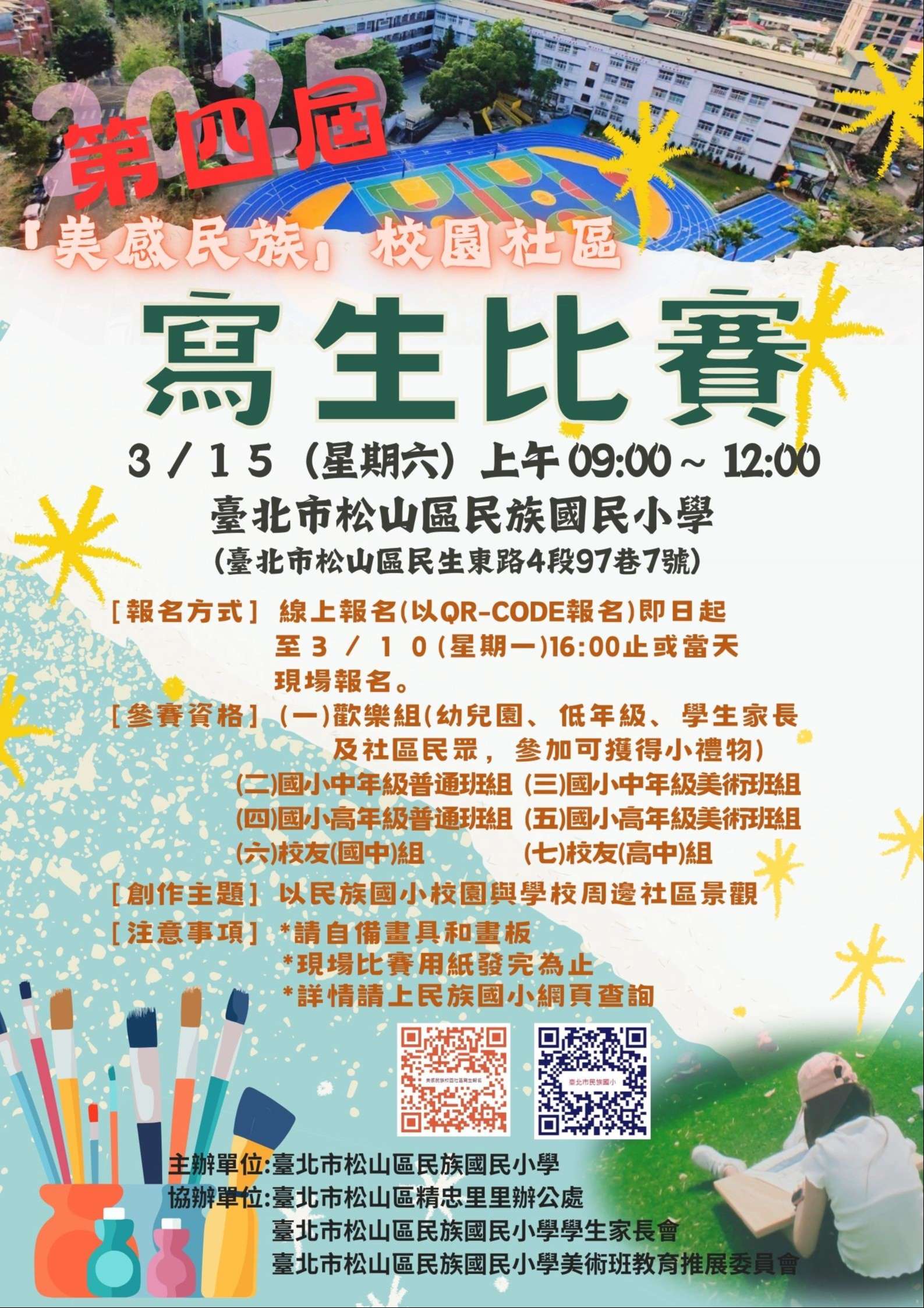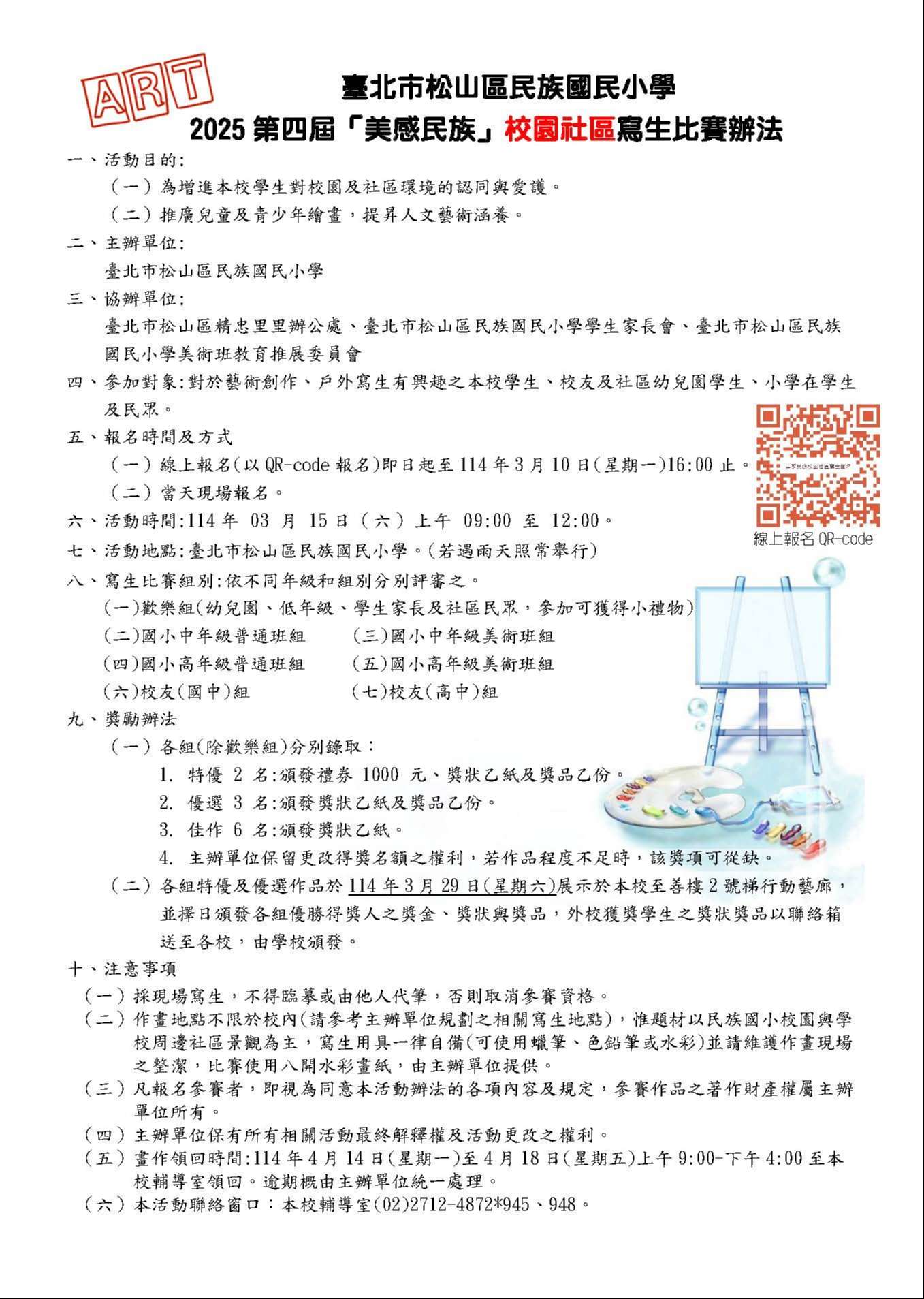 轉知民族國小「2025第四屆美感民族校園社區寫生比賽」活動比賽辦法及海報,鼓勵學生踴躍參加。
