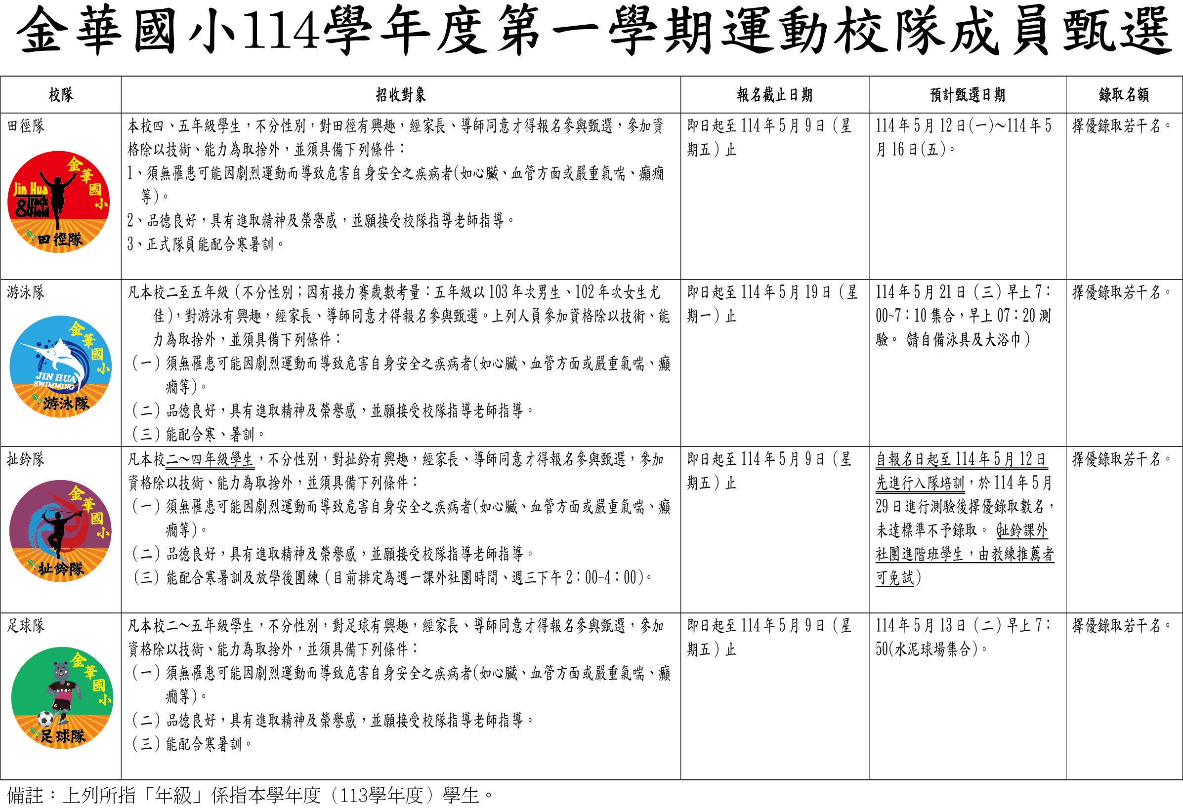一、金華國小113學年度第2學期運動校隊甄選自即日起開始,歡迎踴躍報名。二、報名表可逕至學務處領取或自行下載列印。三、各運動校隊報名資訊整理如下,請務必詳閱簡章,無法配合團隊運作方式與練習時間者,切勿報名。