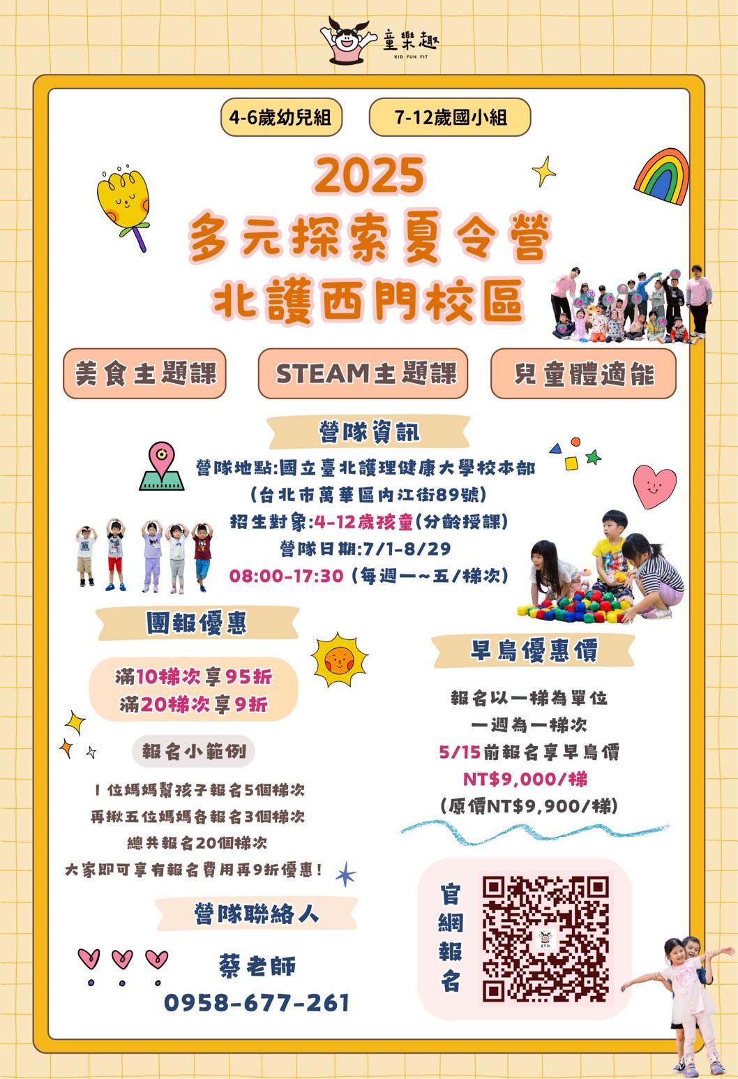 一、旨揭「2025西門校區-多元探索夏令營」謹訂於2025年07月 01日至08月29日開課,即日起受理報名。