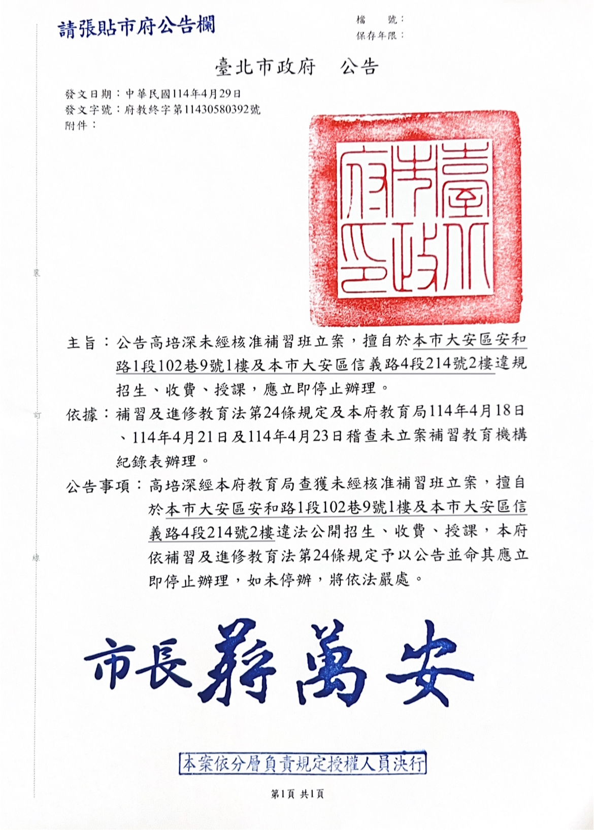 二、高培深經本局查獲未經核准補習班立案,擅自於本市大安區安和路1段102巷9號1樓及本市大安區信義路4段214號2樓違法招生收費、授課,經本局依補習及進修教育法第24條規定裁處及公告,並命其立即停止辦理。