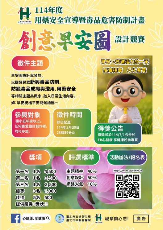 (2)設計主題請以「毒品防制」、「毒品濫用」、「用藥安全」主題為概念融 入日常生活,增加創意以簡單易懂的圖文方式,傳達正確觀念。