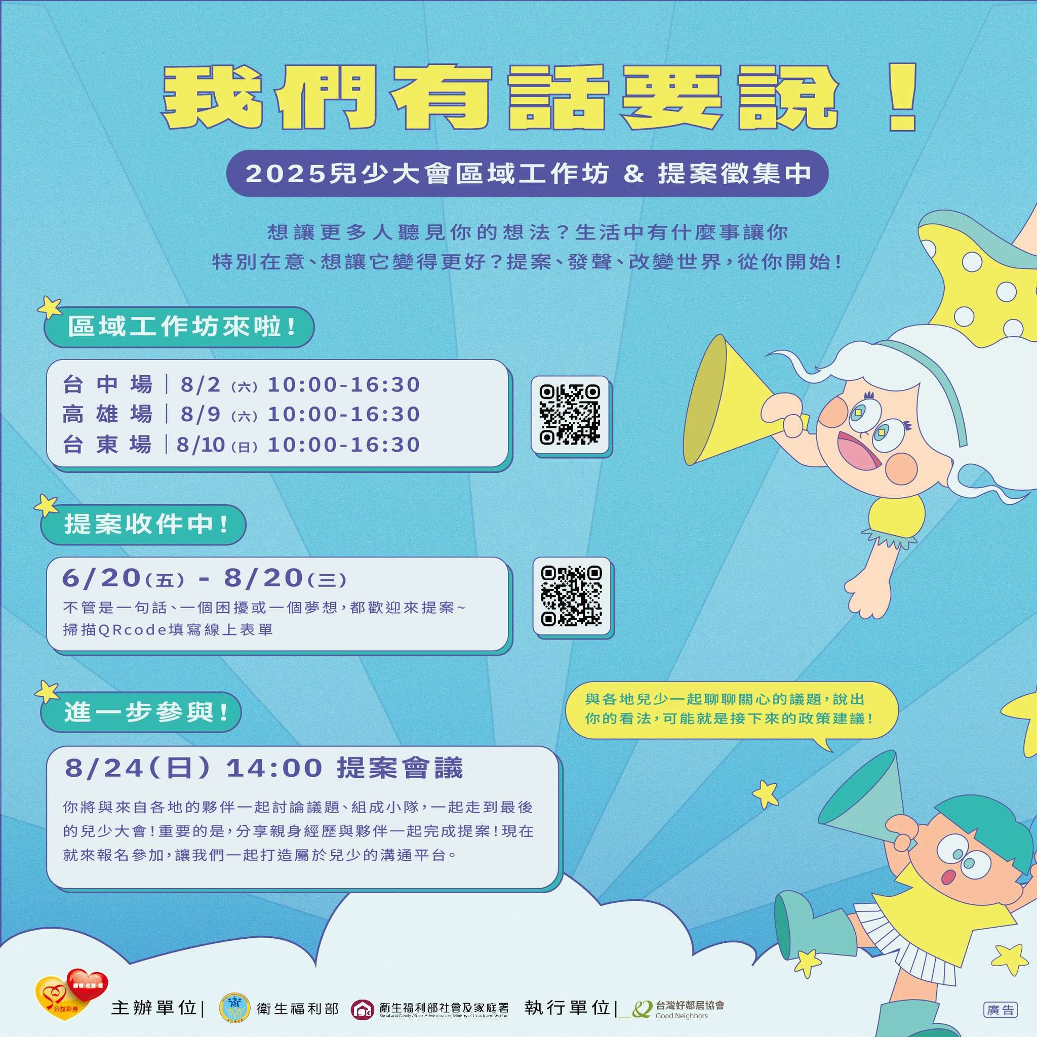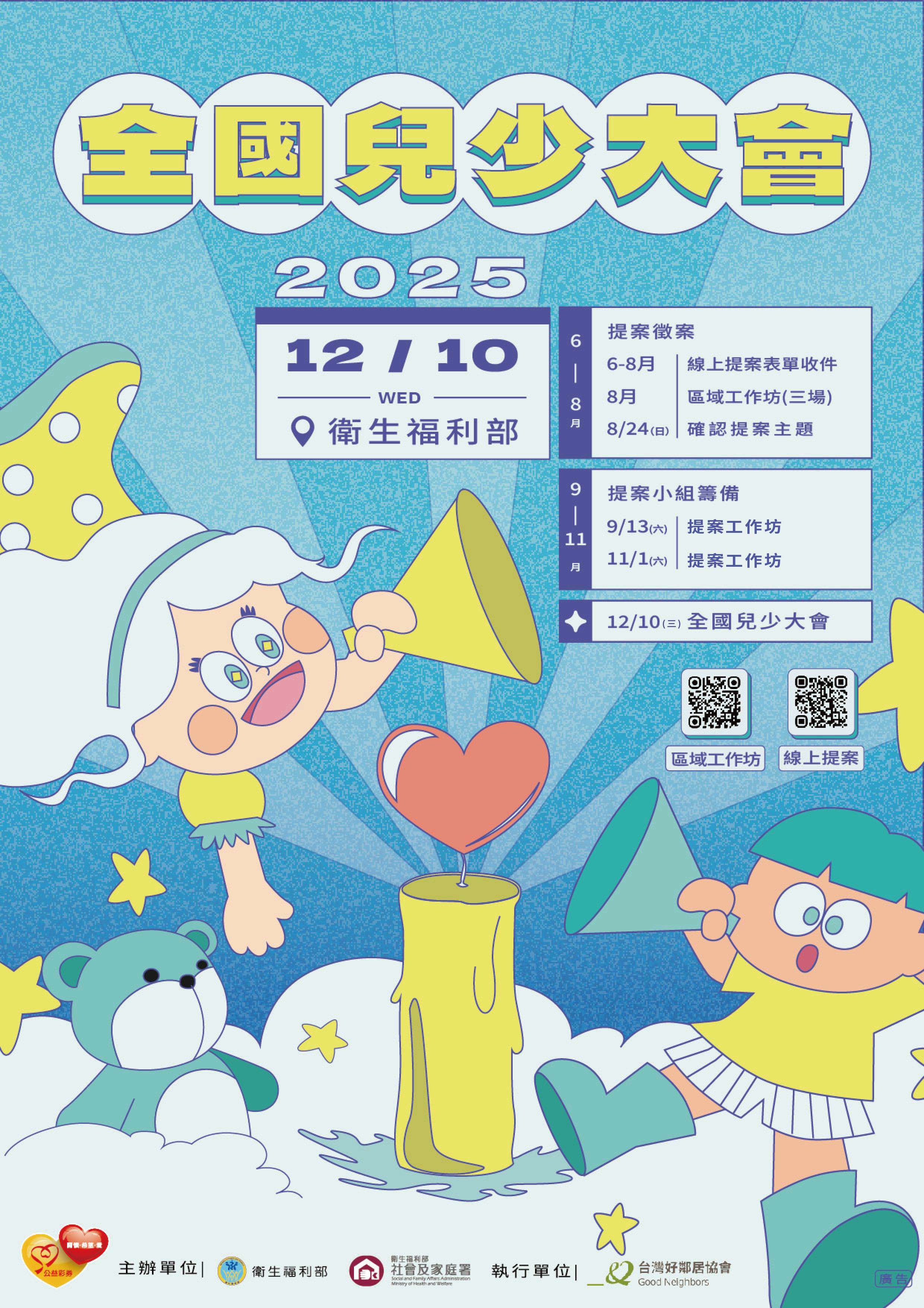 兒少大會是一個讓全國各地的兒童及少年能針對自己生活中關注的公共議題提出想法與建議的平臺。這不是一場大人安排好內容的會議,而是一個由兒少自己籌備、討論、發表、對話的參與空間。 無論你是想改善學校環境、推動心理健康教育、反映交通安全問題,或只是想讓更多人理解你們的生活,這裡都歡迎你來說出來、寫出來、一起來。