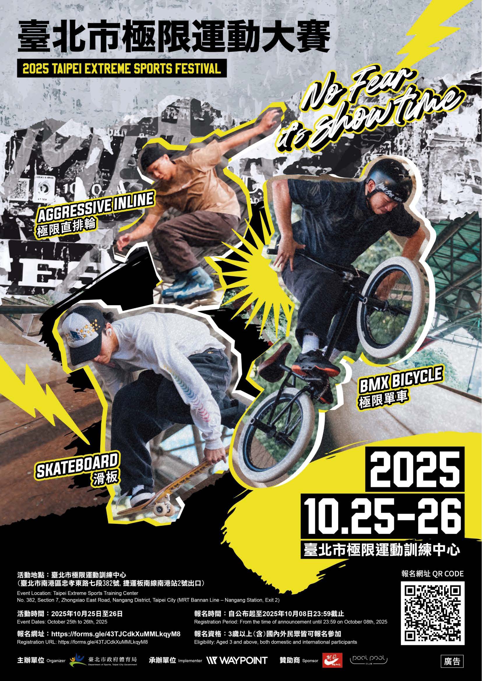一、本活動由臺北市政府體育局主辦,威整合運動股份有限公司(下稱該公司)承辦,訂於114年(以下同)10月25日至26日(星期六、日)假本市南港區極限運動訓練中心舉辦,辦理地點鄰近南港車站及南港捷運站,自即日起至10月8日開放報名。