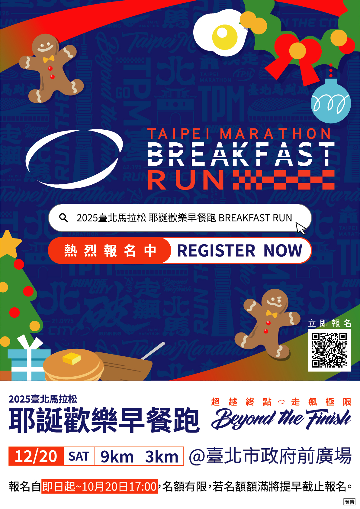 一、臺北馬拉松由臺北市政府、中華民國田徑協會及中華民國路跑協會共同主辦,臺北市政府體育局承辦,為臺北市政府年度重要大型活動。於正式賽前1日114年12月20日(星期六)假本府市民廣場(起 終點)辦理歡樂早餐跑,適合親子參與、初階跑者及學生族群等參加,詳細資訊如下: