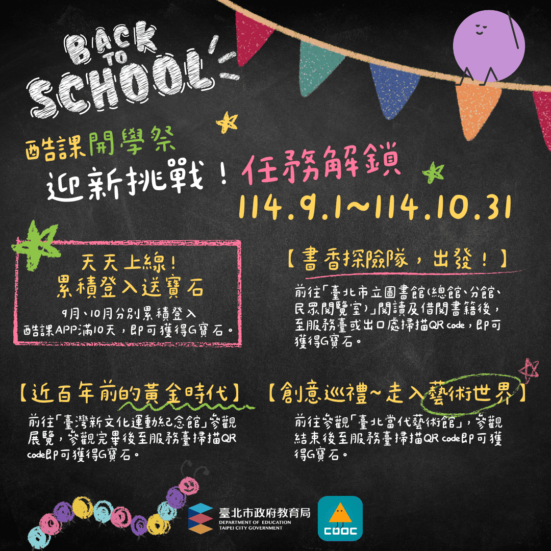 四、 活動方式: 凡本市親師生持校園單一身分驗證帳號登入酷課APP後,至「角色成長」功能 的「任務中心」查看指定任務完成任務並累積 G 寶石即可至該功能的「獎勵商鋪」兌換獎勵品。