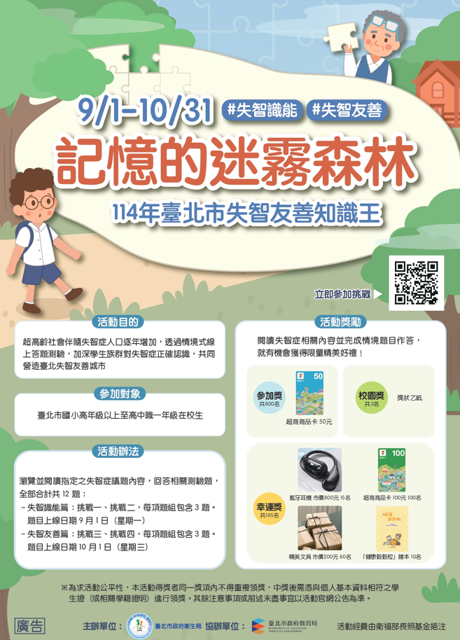一、超高齡社會伴隨失智症人口逐年增加,本局辦理旨揭活 動,透過情境式線上答題測驗,加深學生族群對失智症認 識,共同營造失智友善環境,活動資訊摘述如下: