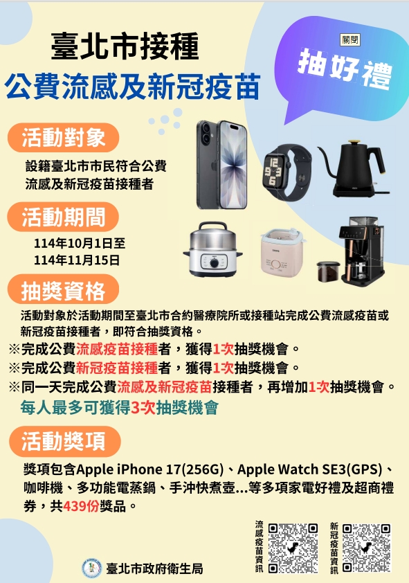 二、凡設籍臺北市市民符合公費流感及新冠疫苗接種者於114年 10月1日至11月15日期間,於本市合約醫療院所或接種站完 成公費流感疫苗或新冠疫苗接種者,即符合抽獎資格。活 動期間共辦理2次抽獎,第1次抽獎未獲獎名單併入第2次抽 獎,得獎名單將分別於114年11月5日前及11月25日前公告 於衛生局官網。
