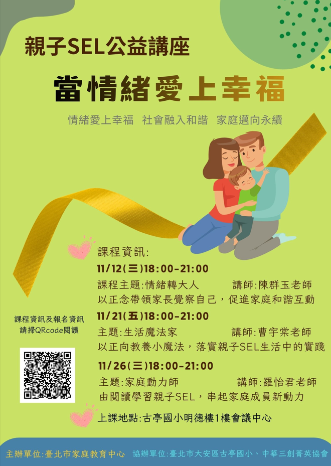 *古亭國小與中華三創菁英協會辦理親子SEL公益講座三場,活動內容以讓家長對SEL社會情緒學習有更多認識,進而融入家 庭親子互動,提升教養功能。
