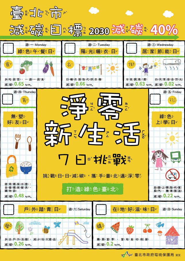 為使環境素養及永續意識向下扎根,培養大家理解氣候變 遷與減碳議題,從日常中實踐低碳行為,環保局特製「兒童 版淨零新生活-7日挑戰」宣導海報,共同邁向2030減碳 40%,請大家共同響應淨零生活。