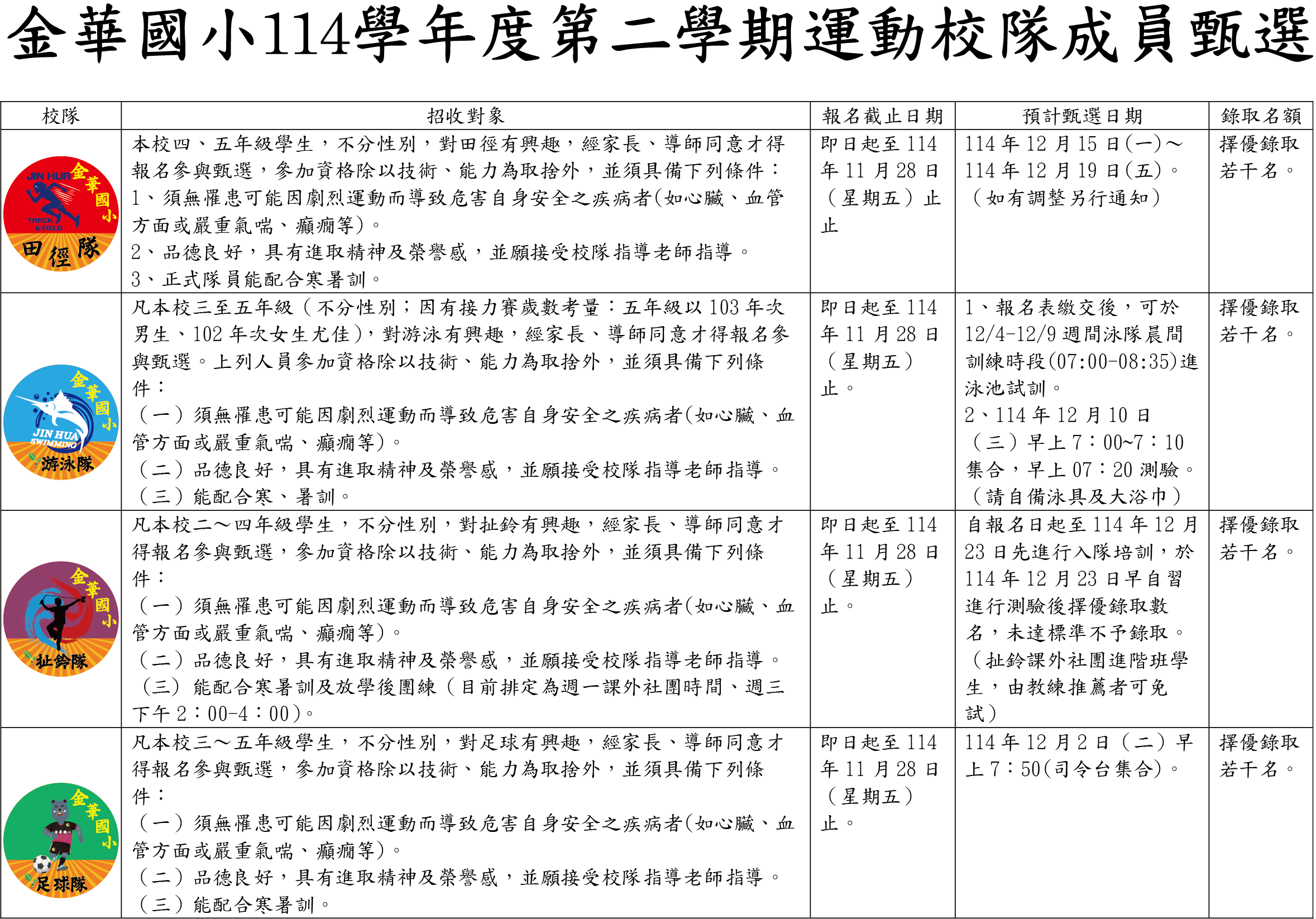 一、金華國小114學年度第1學期運動校隊甄選自即日起開始,歡迎踴躍報名。二、報名表可逕至學務處領取或自行下載列印。三、各運動校隊報名資訊整理如下,請務必詳閱簡章,無法配合團隊運作方式與練習時間者,切勿報名。
