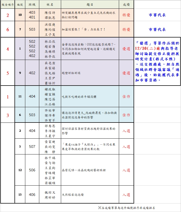 114年12月31日經校內自然領域社群會議決議,兩件「優選」作品送交之修正研究計劃皆予以『通過』,取得代表本校參加今年度臺北市科學展覽競賽資格,期待參賽選手都能有精彩表現。