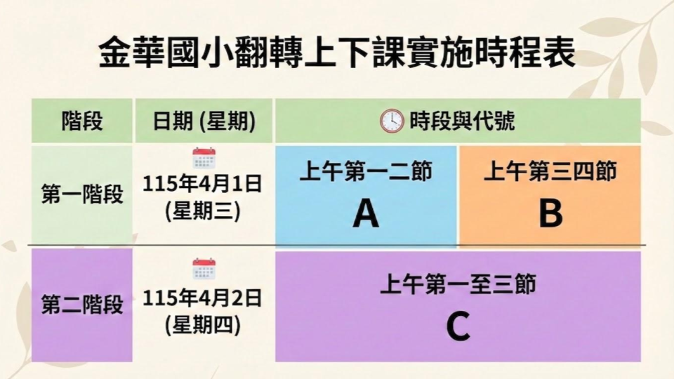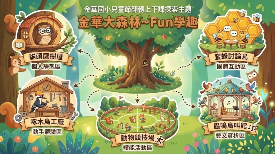 金華國小4/1、4/2兒童節翻轉上下課活動,分成貓頭鷹樹屋(個人靜態區)、蜜蜂討論島(團體互動區)、啄木鳥工廠(動手體驗區)、蟲鳴鳥叫館(藝文賞析區)、動物競技場(體能活動區)等5種學習空間型態。