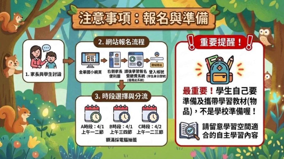 請連結金華國小網頁→右側家長便利屋→課後學習報名暨繳費系統(借用該系統報名自主學習的空間選擇)→登入帳號(學生身分證號)開始報名→分成A(4/1上午一二節)、B(4/1上午三四節)、C(4/2上午一二三節)時段選擇學習空間。額滿採電腦抽籤。請留意學習空間適合的自主學習內容。